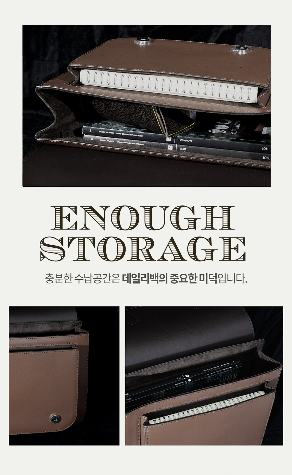 자주 쓰는 짐들이 항상 들어 있어도 수납에 여유가 있도록 넓은 수납 공간을 디자인했습니다.