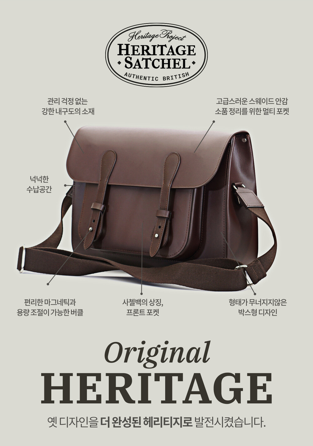 헤리티지사첼은 고급 가방에서만 적용되는 박스형 디자인으로 이런 옛디자인의 문제점을 해결하였습니다.